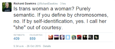 I think that Dawkins is correct on this one, the meaning of man is "an adult human male." and the meaning of male is "of or denoting the sex that produces gametes, especially spermatozoa, with which a female may be fertilized or inseminated to produce offspring." in which case it IS semantics since it is an adjective, a word used to describe those whom are capable of producing semen fall under whether they like it or not.