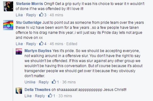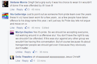 These are just a few of the comments being made on Leicester Pride's Facebook page. I've been told that I'm being PC, that I'm overly sensitive, that they can use that word because they're a drag artist, that I'm a 'fucktard', that I should never leave my house. This is the reaction from the LGBT+ community, to launch into an attack where I'm the villain for asking why a slur word was used.