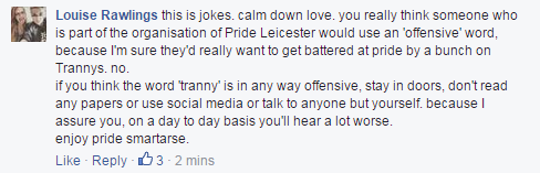 The entire conversation thread, including dozens more abusive comments, has now been deleted by the Leicester Pride page admin. The page has also been made so that all posts and comments must be approved by their page admin, effectively preventing anyone from speaking out on this incident and any other issues that people may have.