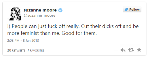 | Suzanne Moore strikes out at the trans community via Twitter. |