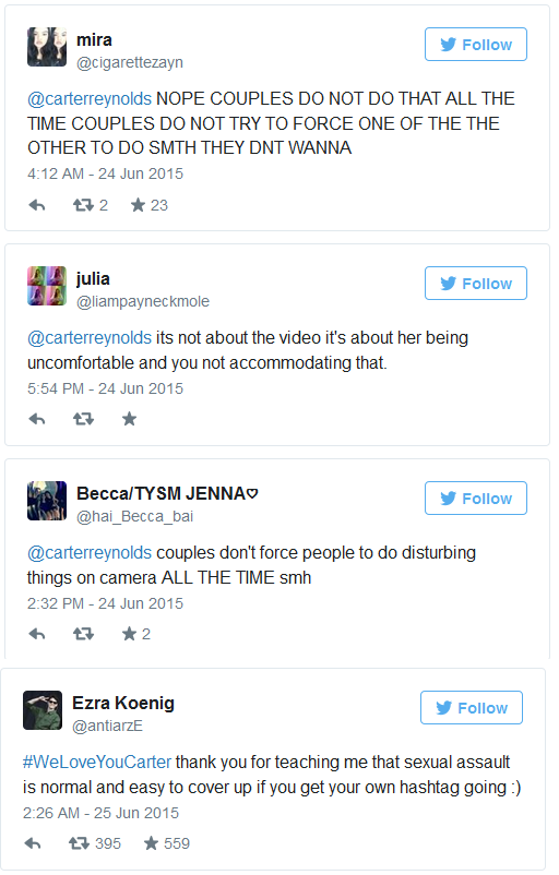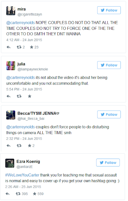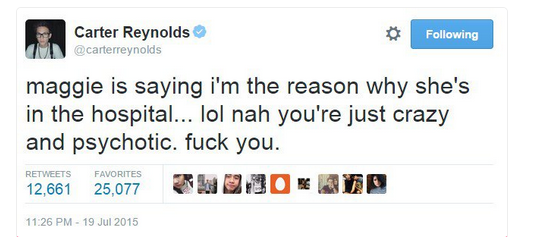 I can only hope that not only will Maggie Lindemann make a full recovery but that Carter Reynolds fans come to their senses and see that his actions are wrong. I hope that they see that his actions are not 'love', that love is not harassment, that it is not forcing your partner into sex acts they don't wish to do, it's not bullying and abusing them because they want to leave you and won't take you back. Carter Reynolds is an abuser, plain and simple, and should be used as an example of the kind of actions that are not acceptable and the kind of men that young women should avoid at all costs.