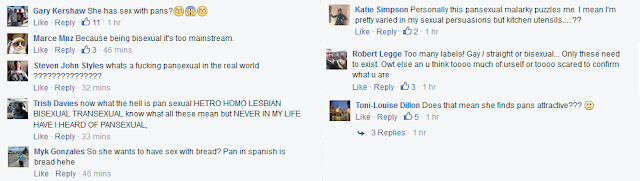 Just some of the comments I've seen range from the common and 'funny' jokes about having sex with kitchen utensils (really fucking funny guys) to people stating that pansexuality doesn't even exist, that it's just something made up.